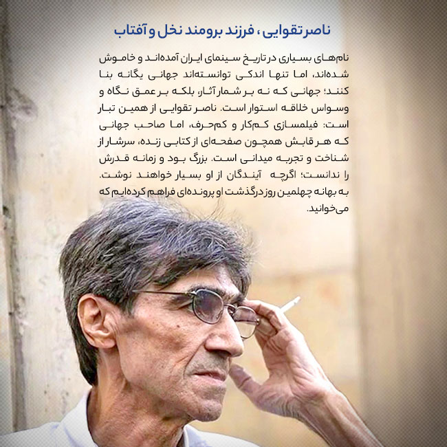 ناصر تقوایی فیلمساز مؤلف و جریان‌ساز ایرانی بود که با وجود آثار محدود، کارنامه‌ای بسیار اثرگذار بر جای گذاشت. او با فیلم‌ها، سریال دایی‌جان ناپلئون، مستندهای شاعرانه و نوشته‌های ادبی، واقع‌گرایی و طنز را با نقد اجتماعی و فرهنگی درآمیخت. تقوایی منتقد سانسور و ساختارهای بسته بود و حتی خانه‌نشینی و فیلم‌نساختن را نوعی اعتراض می‌دانست تا راهی برای تولد سینمایی تازه گشوده شود. کیوان کثیریان منتقد سینما در این یادداشت نگاهی جامع به تقوایی داشته است و جلوه‌های هنر او را برشمرده است که می‌خوانید.